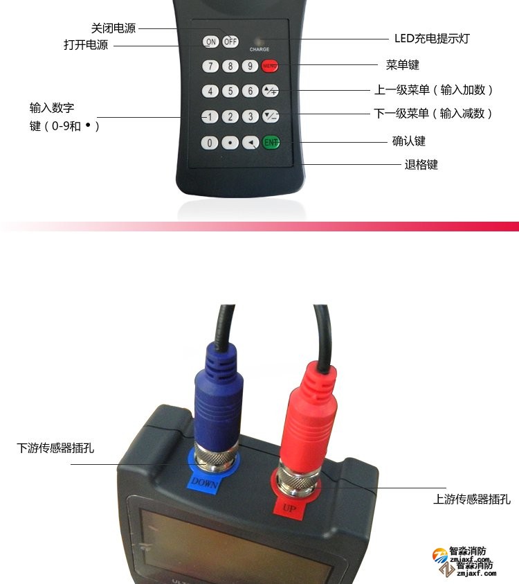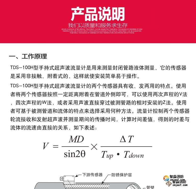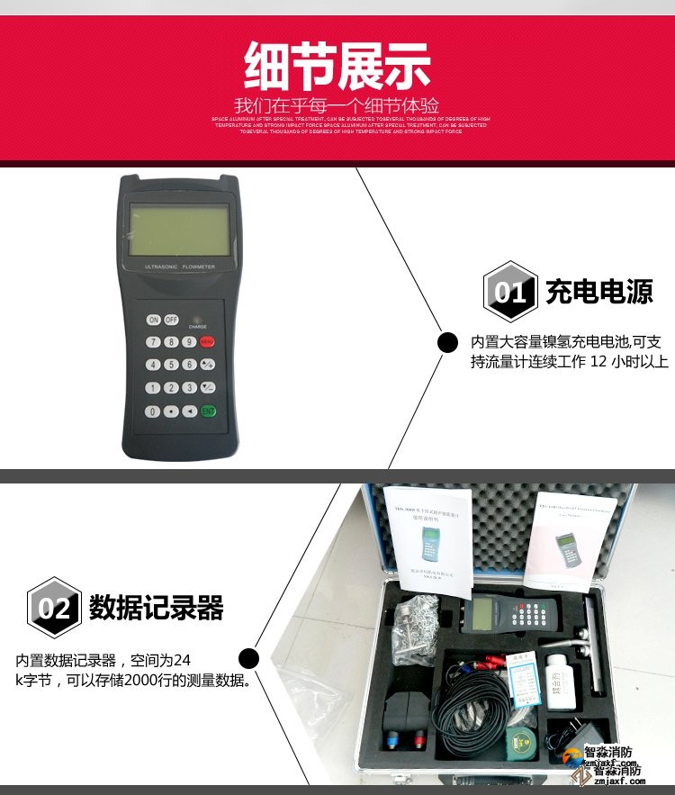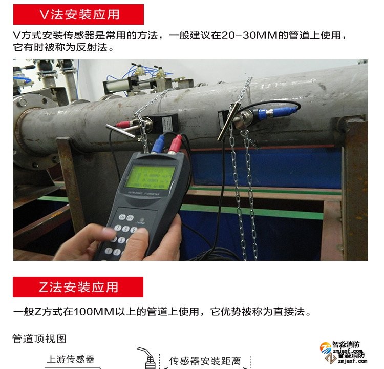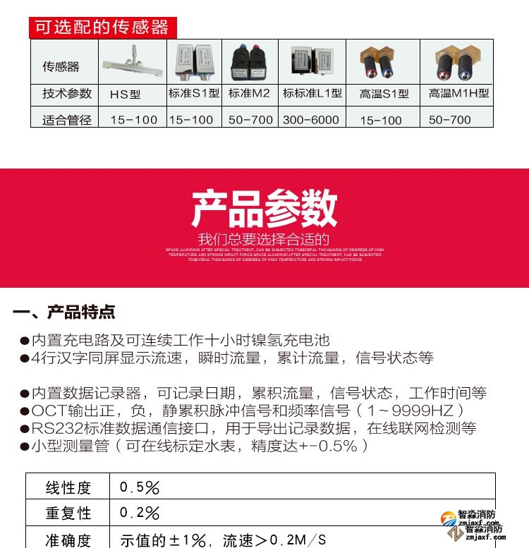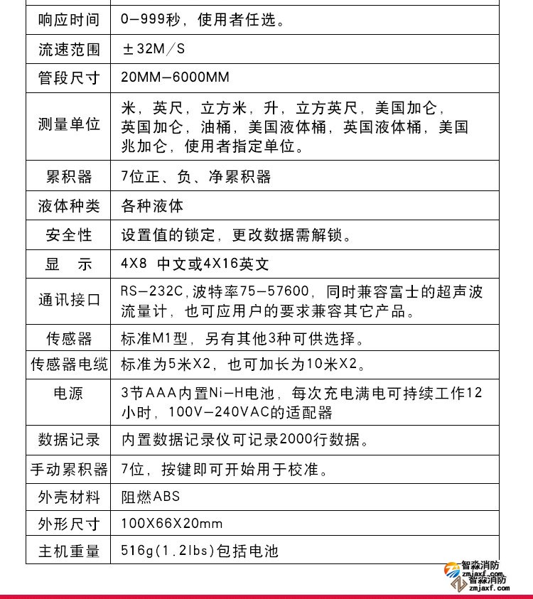 超聲波流量計測量管徑范圍:0mm~300mm;WWW.XFJCYQ.COM精度:±1%用于檢測消火栓系統和水噴淋系統的給水量以及消防豎管的流量分配。